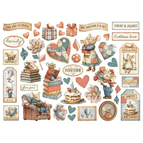 Ces die cuts vous transportent dans l'univers doux et chaleureux de la famille. Découvrez d'adorables souris en famille (couple élégant, souris avec gâteau d'anniversaire, souris en patchwork avec cœurs), des ours en peluche, des valises vintage, des livres empilés, des cadeaux, des montgolfières, des oiseaux, des tasses de thé, des cerfs-volants patchwork, des cœurs patchwork, des tags ("Love you so much", "Live together is a gift", "Today & always", "Endless love", "Adorable", "Laughter", "Happy Birthday", "Family", "Happiness", "Together", "For you"), des médaillons, des étoiles, des cœurs et bien d'autres motifs aux tons pastel bleu et corail parfaits pour vos albums famille, projets souvenirs ou créations home sweet home ! 💕🏡