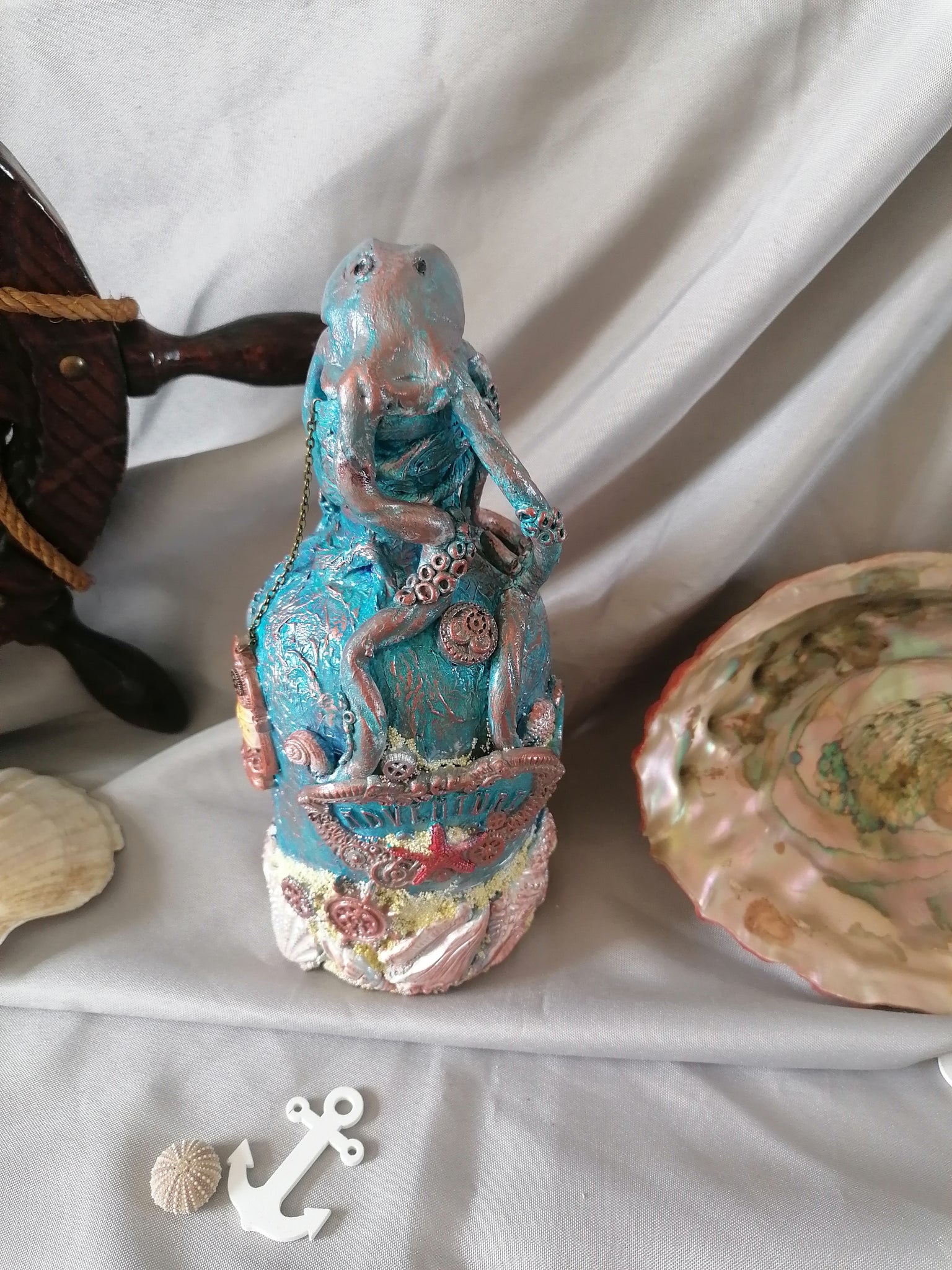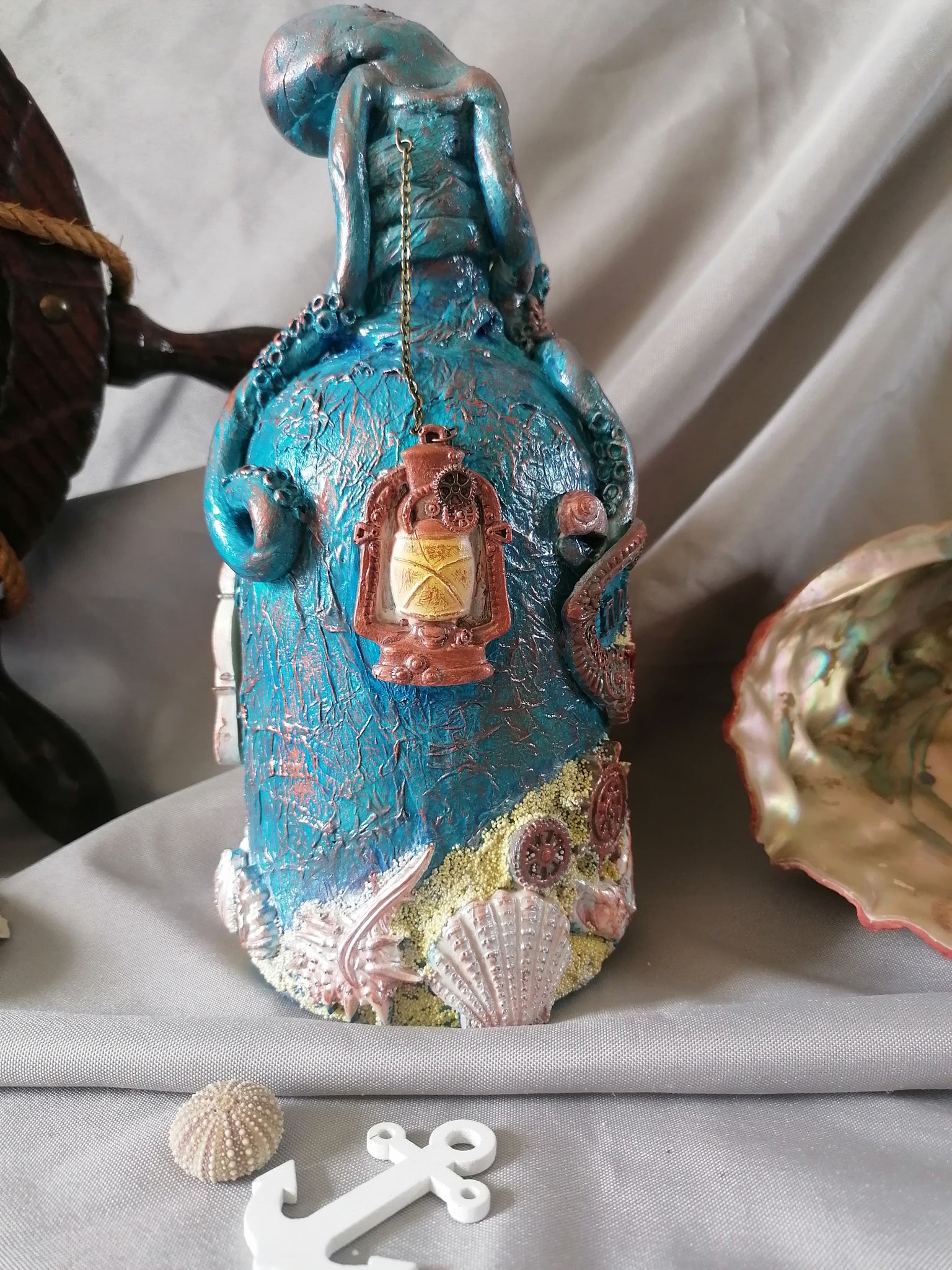 Plongez dans l'univers fascinant de "Octopus", une œuvre unique qui combine travail minutieux et créativité. Cette bouteille décorative est une véritable pièce d'art, réalisée sur une bouteille récupérée, transformée et ornée avec des moulages en résine et une pieuvre modelée à la main avec de la pâte auto-durcissante.