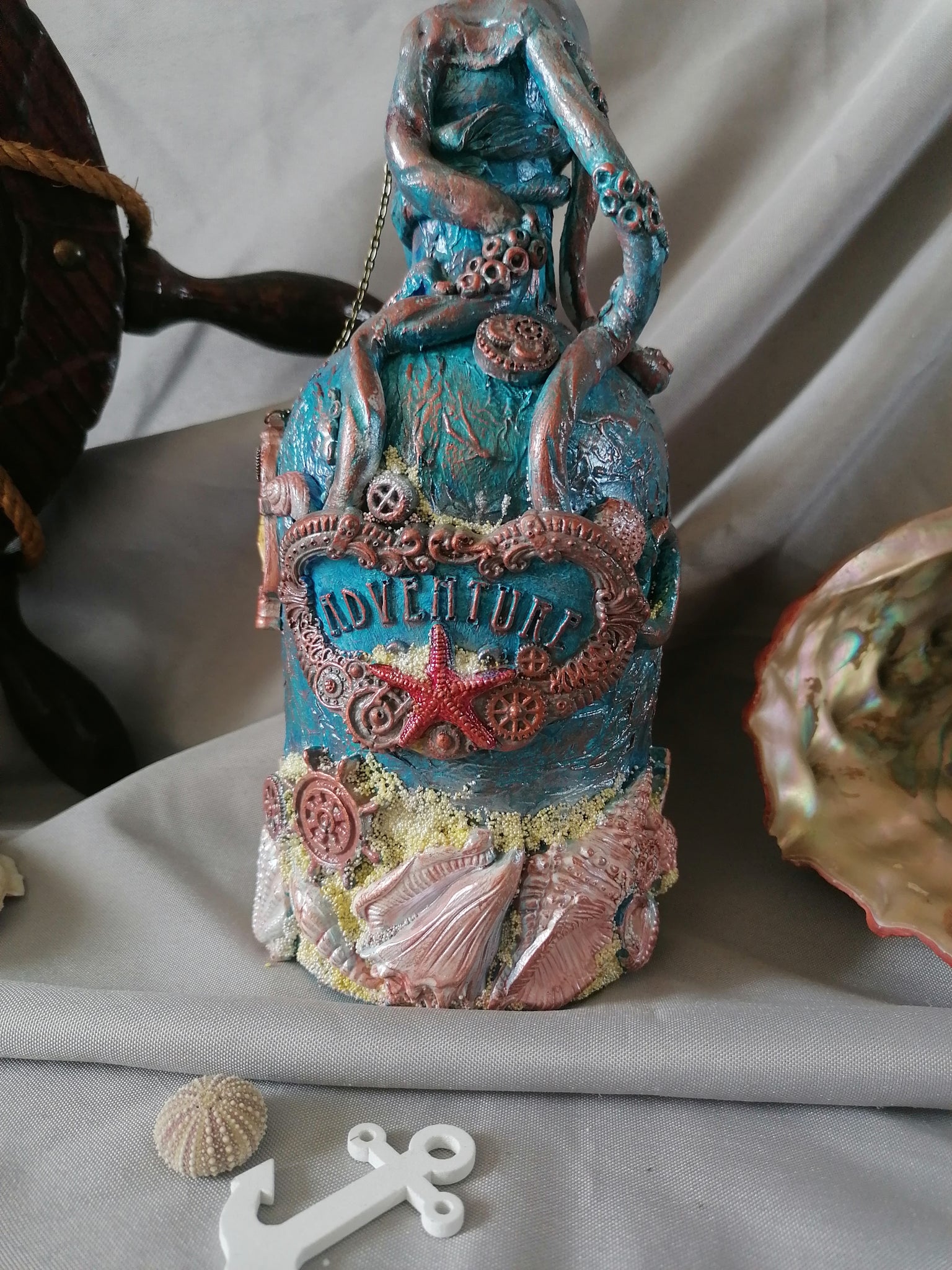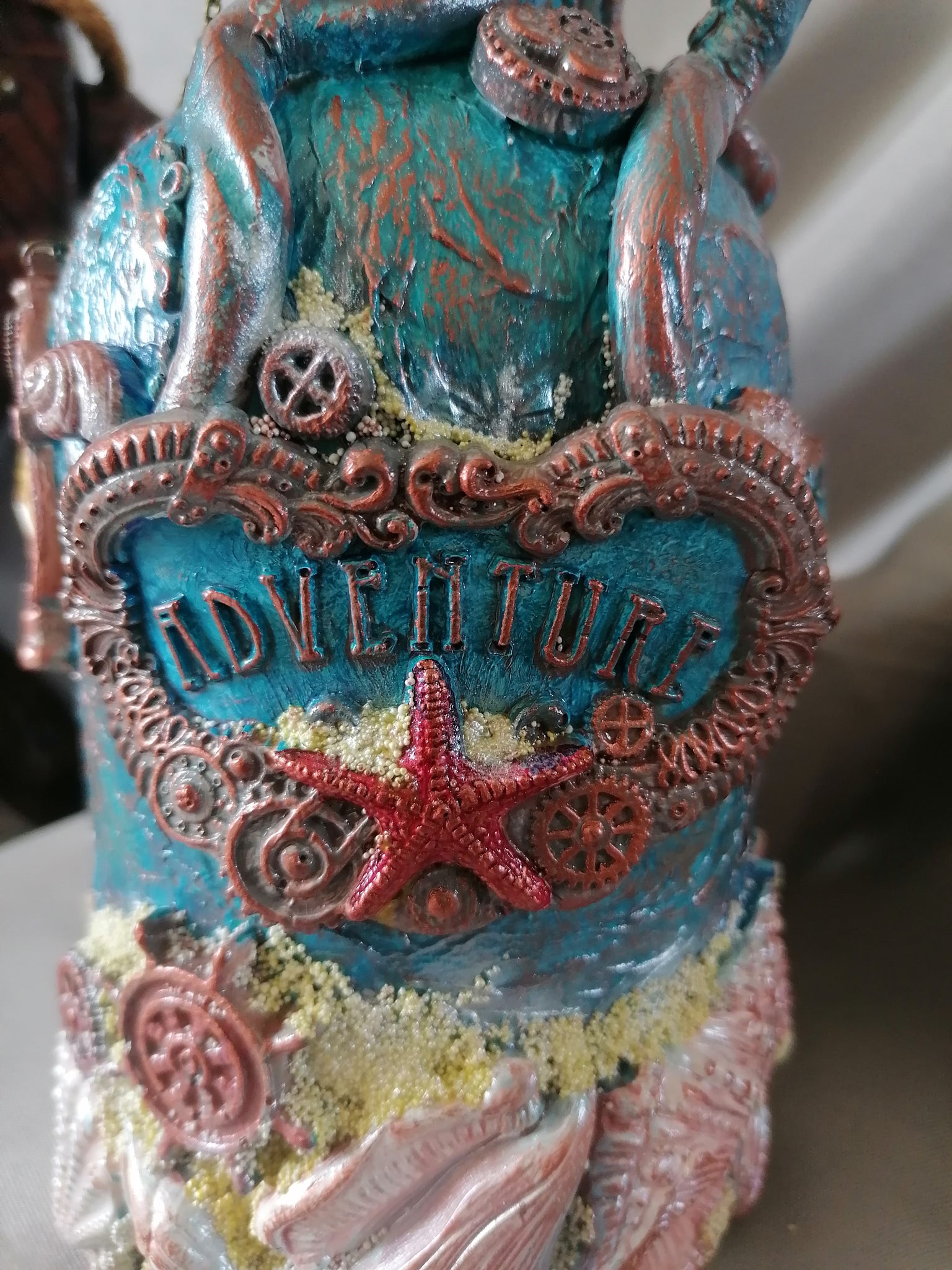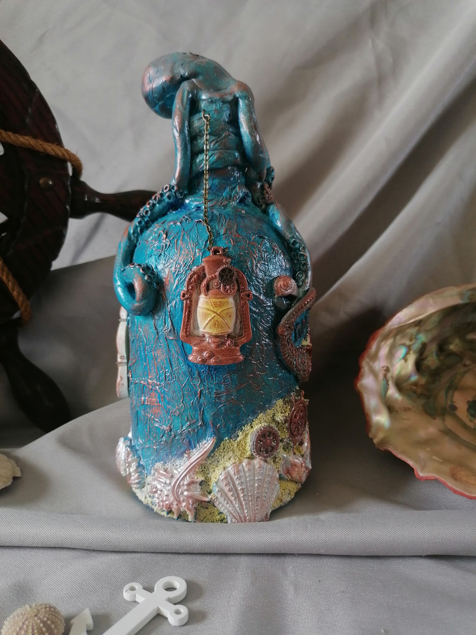 Chaque détail, du corps des tentacules de la pieuvre aux éléments marins qui l’entourent, a été sculpté à la main pour une finition soignée, ce qui donne un résultat à la fois réaliste et fantastique. L'utilisation de résines pour les décors marins comme les coquillages, les engrenages et la texture, associés à une palette de couleurs vibrantes bleu turquoise et cuivré, apporte un charme unique à cette bouteille. Le mot "ADVENTURE" orne le centre de l'œuvre, évoquant un esprit de voyage et de découverte.