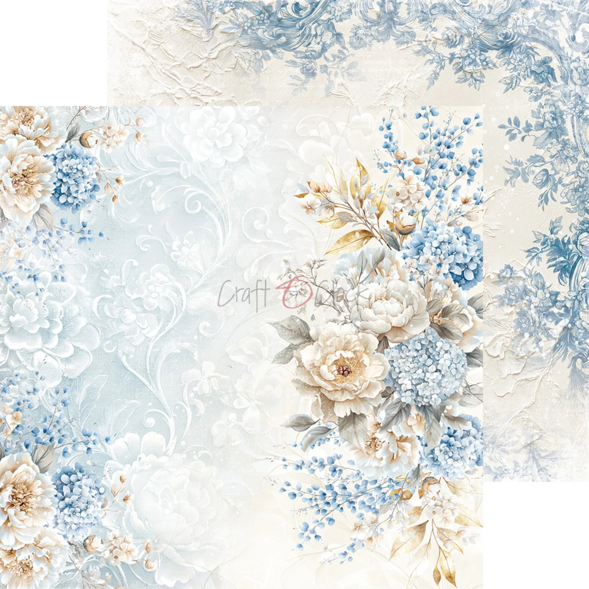 Plongez dans un univers romantique et délicat avec cette collection aux tons bleus doux et floraux. Des hortensias bleus, des pivoines blanches et des motifs shabby chic créent une atmosphère empreinte de tendresse et d'élégance parfaite pour vos créations les plus romantiques.